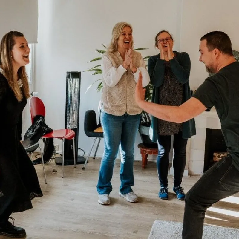 Met eenvoudige spel- en improvisatieoefeningen kun je meer uit je hoofd komen en meer in je lijf. Samen spelen kan zichtbaar maken waar je vastzit en waar ruimte ontstaat om iets anders te kiezen. Niet door erover te praten, maar door het te ervaren; samen spelen creëert verbinding, (zelf)vertrouwen en plezier. Je hoeft geen toneelervaring te hebben en er is geen podium. We spelen om het spelen.