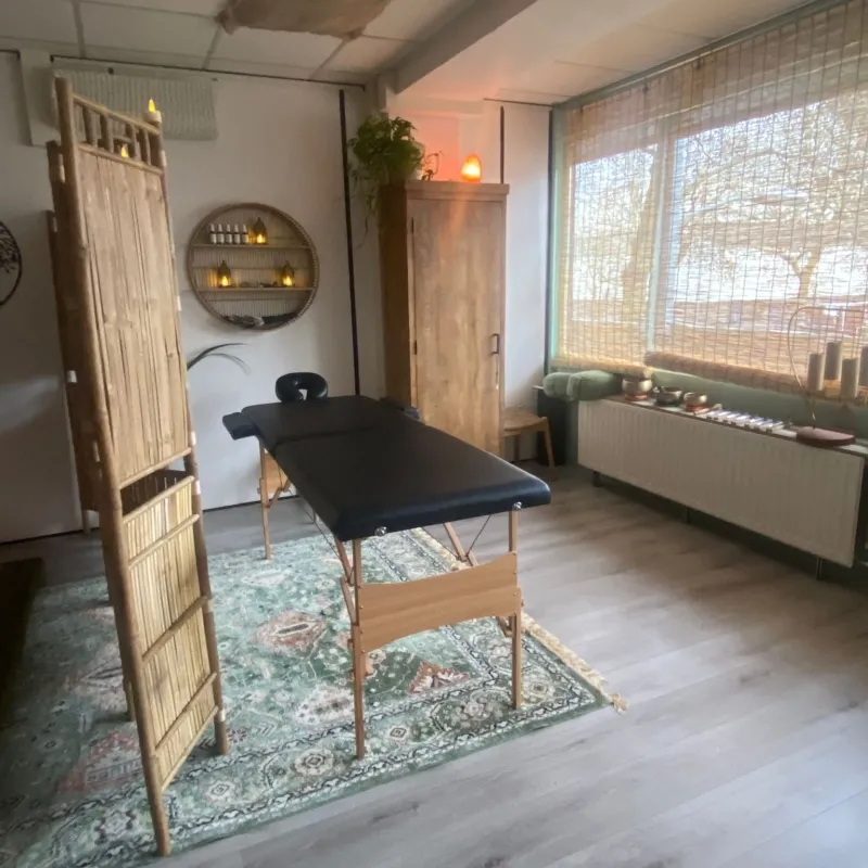 De ruimte beslaat een oppervlakte van maar liefst 27m2 en is helemaal 'zen' ingericht (zie voor de gehele ruimte de overige foto's) en je mag het gehele meubilair gebruiken. Het is gelegen op de 1e etage (zonder lift) en de gezamenlijke keuken heeft een koelkast, kookplaatje, magnetron en waterkoker. Op de begane grond is een wachtruimte.